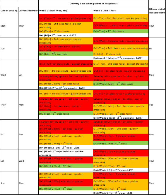 - lower quality of service targets for both first and second class post.